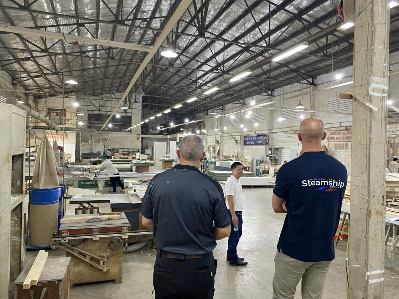 Earlier this month, Stuart Reid travelled to Vietnam for an important stage in the vessel build. His visit included time at the Piriou shipyard to inspect progress on both vessels, as well as a stop at the furniture manufacturing factory to review materials and the quality of construction for the passenger lounges furniture and interior outfitting.