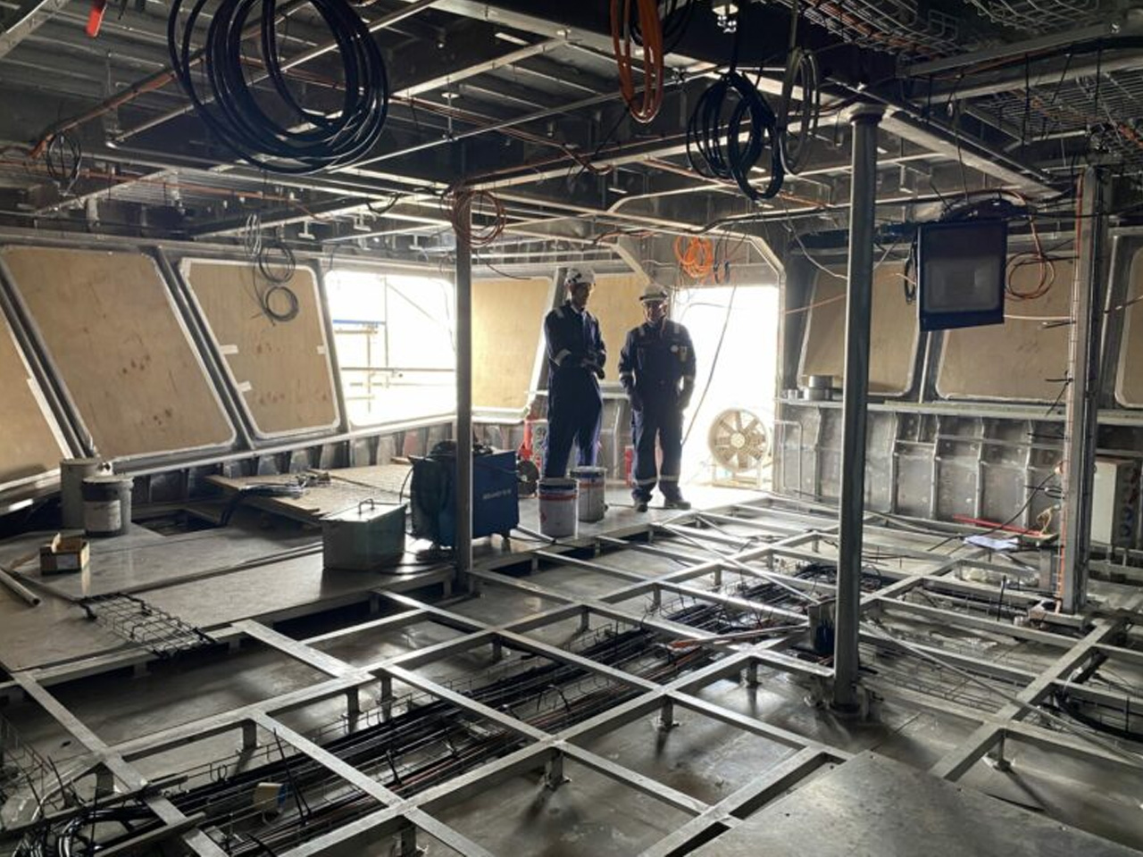 Since Stuart’s last visit, the transformation has been remarkable: hull units fully integrated, staircases and engines in place, windows being installed, and electrical teams laying kilometres of cabling each week.