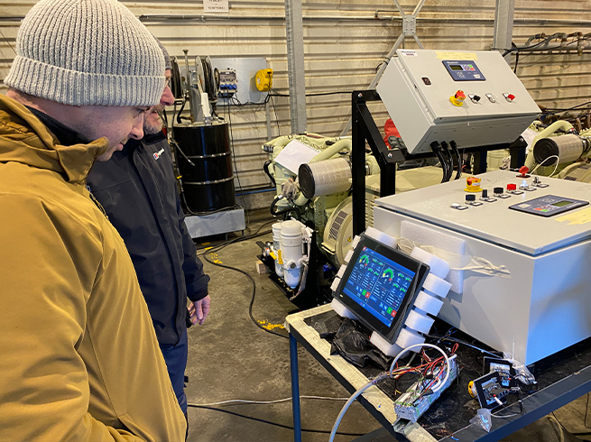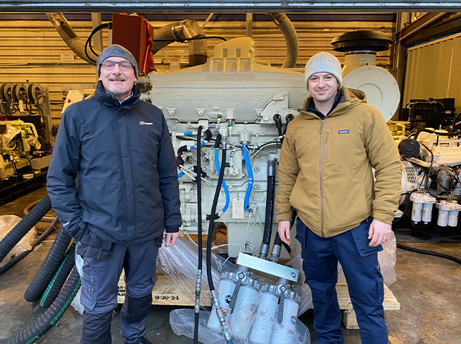 Chris Lingham and Scillonian III marine engineer Sam Noye have been in Nantes, France, visiting Mecatlantic, to attend factory acceptance tests for some of the electrical generator sets for both Scillonian IV and Menawethan.
