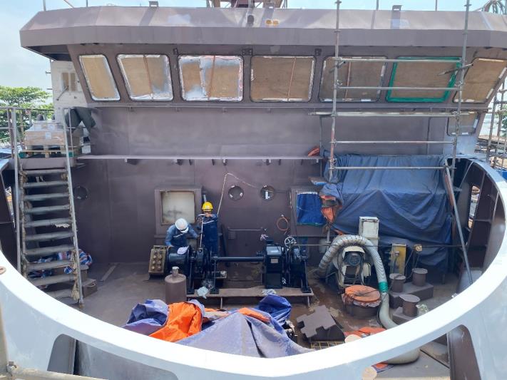 Installation of machinery, piping, valves, and related equipment is progressing well. The rescue boat davit is installed, along with windlass and anchor chain stoppers. Temporary shore power has been connected to operate the hydraulic systems for the side door and pallet lift.