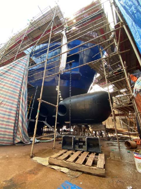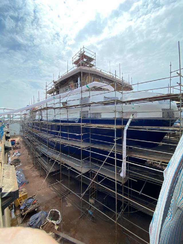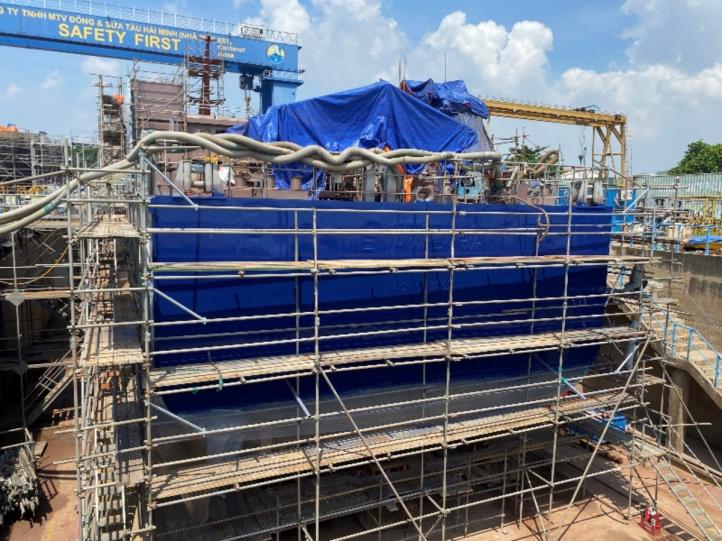 All hull structural tests are complete. Work continues with the 5-coat antifouling system, and areas of the hull have been blasted and painted following docking block relocation. Blue paint is progressing well on the topsides of the hull and white around the wheelhouse areas. All the hull markings, names and logos have been painted in white on the port and starboard bow and stern. The specially designed rubber fenders have been fitted to the hull on the port and starboard sides.