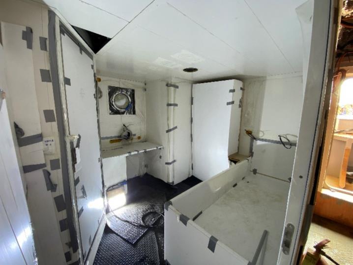 Crew and passenger accommodation work continues, including ceiling panels, window boxes, and furniture installation.