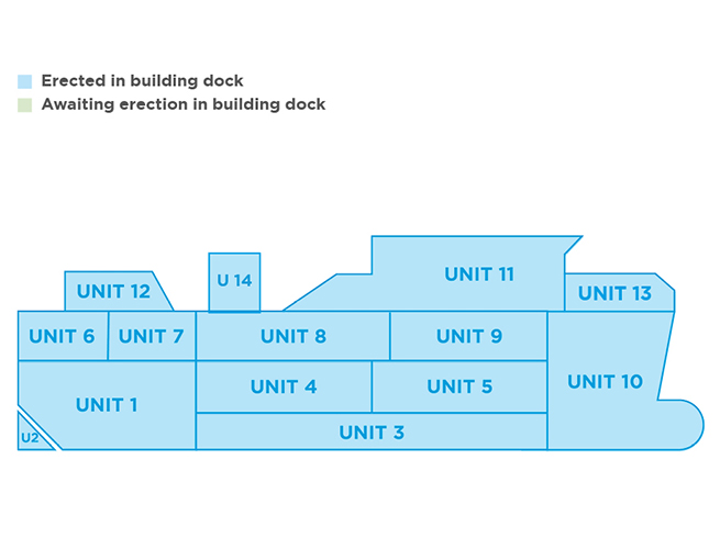 The impressive unit 11, which includes the wheelhouse, passenger lounge and crew accommodation, and units 12 (the engine casing) and 13 (the forward bulwark) have all been integrated with the rest of the hull in the building dock.