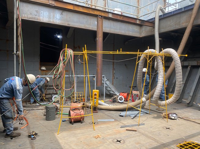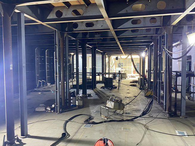 Blasting and painting of tanks and void spaces is also now underway, and the propellers, shafts and inner stern tubes have arrived. Preparations for mounting the outer stern tubes is underway.
