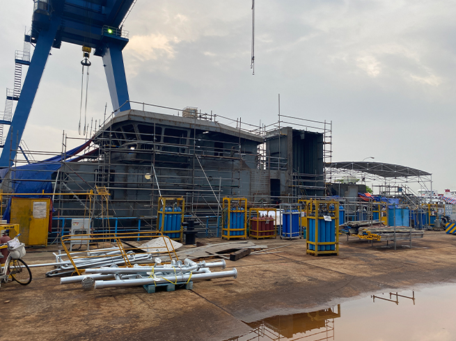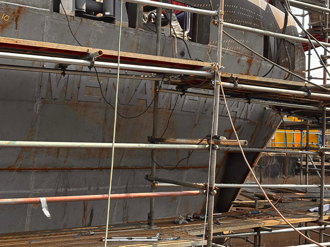 Menawethan now resembles a complete ship, with all hull blocks fully integrated in the building dock. On 12th March 2025 the final hull block, unit 14, was erected with the hull in the dock. This is the upper part of the cargo lift trunking and will contain the hydraulic ram for the cargo lift and also the structure to support the side shell door.