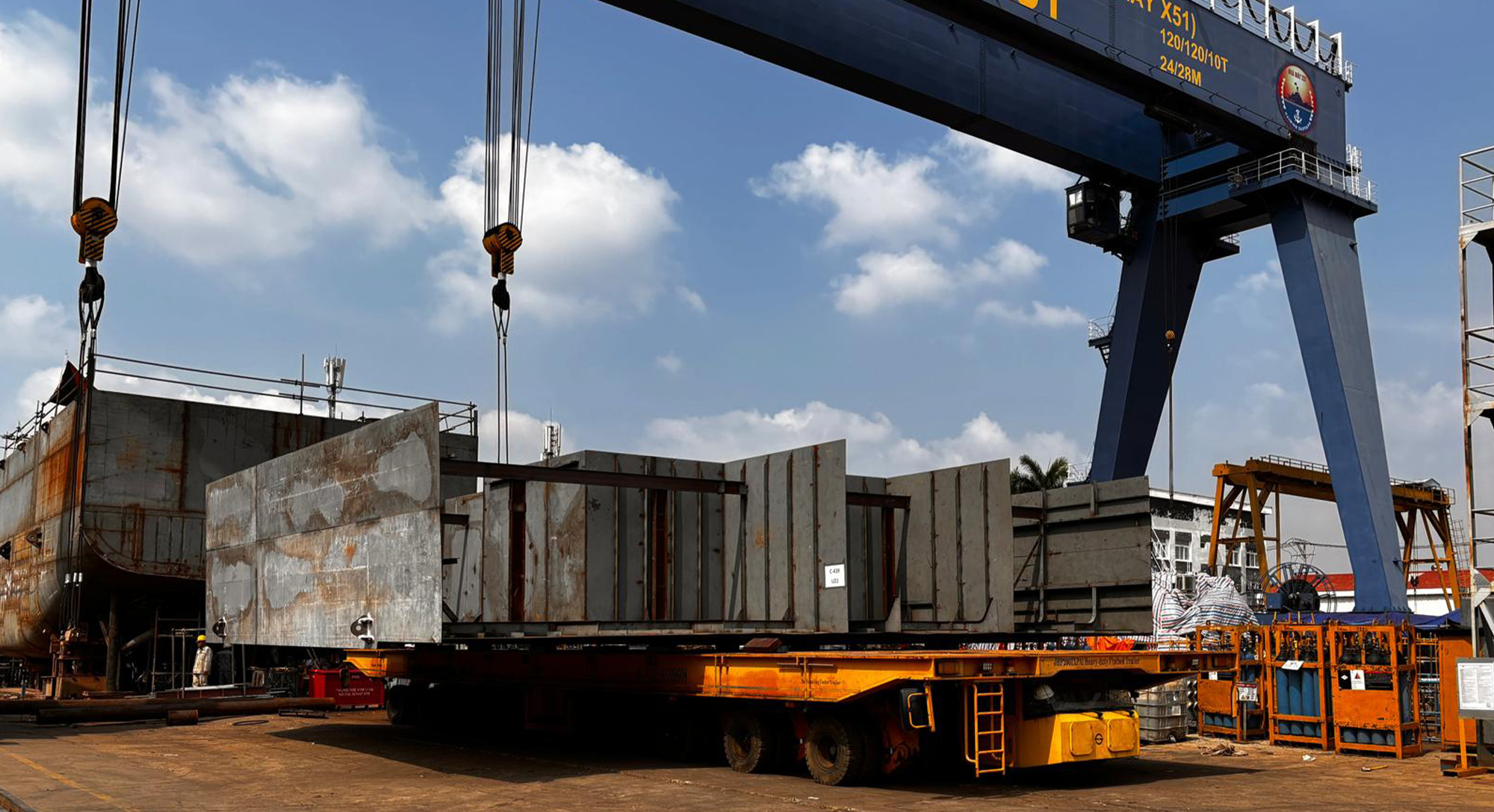 On the quayside, units 8.1, 8.2 and 9, hull blocks of the bow section are being fabricated and the largest block of all, unit 4 (the main engine room, switchboard room and steering gear room) is being fabricated in a workshop within the shipyard.