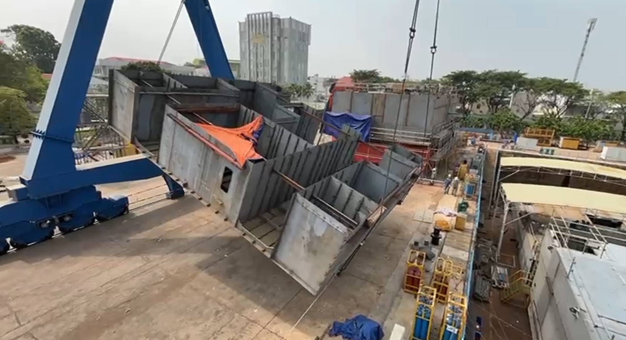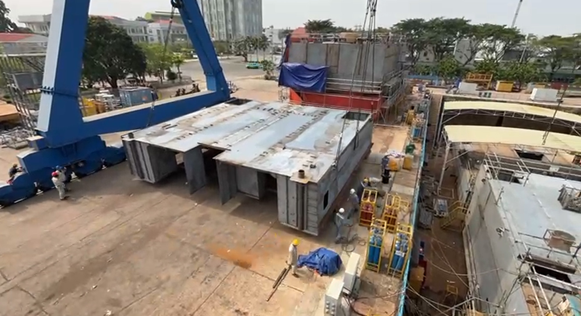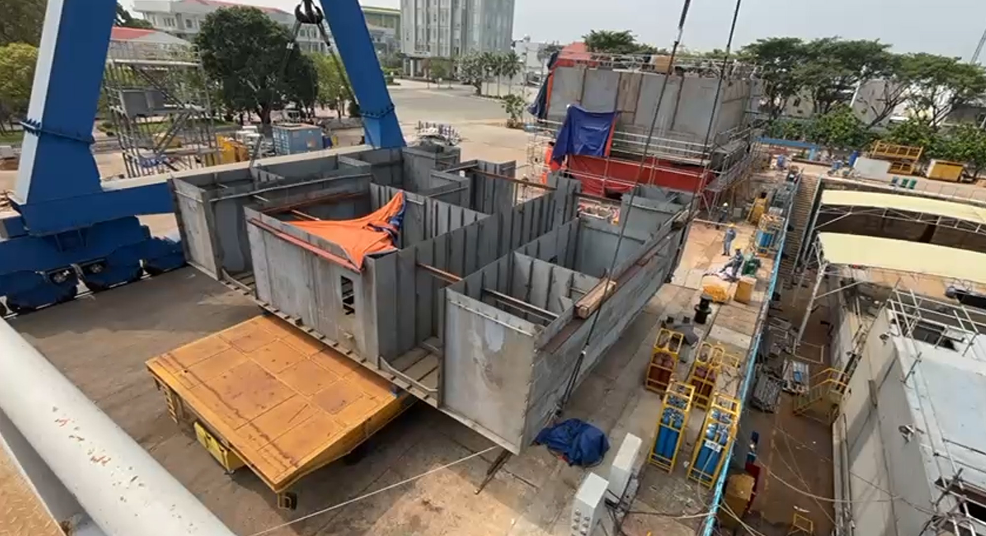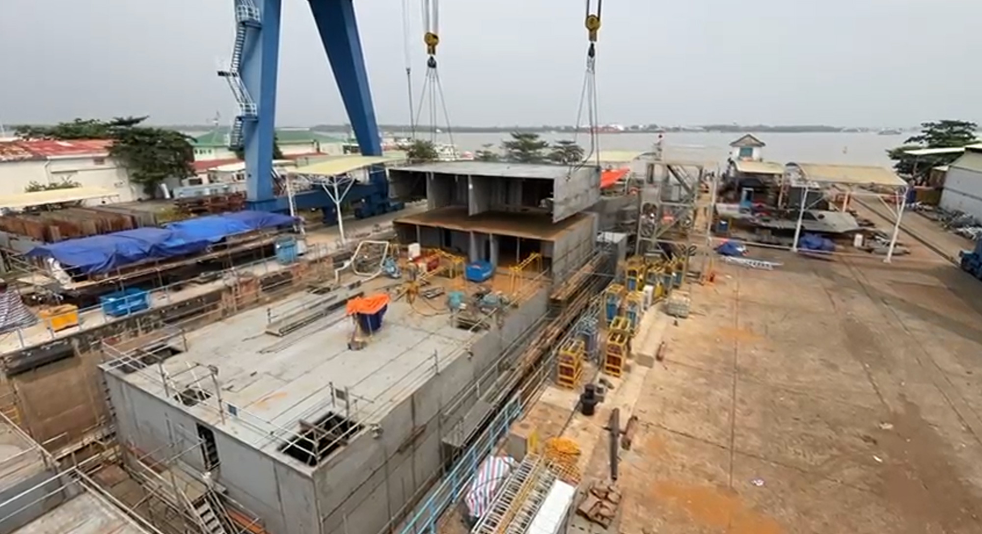 UNIT 22 INTEGRATION The main mid-section of the hull comprising a block of eight units, is now in situ in the dock. Units 21 and 22 (part of the upper passenger lounge, staircase and elevator shaft) have been integrated on top of units 14 and 15.
