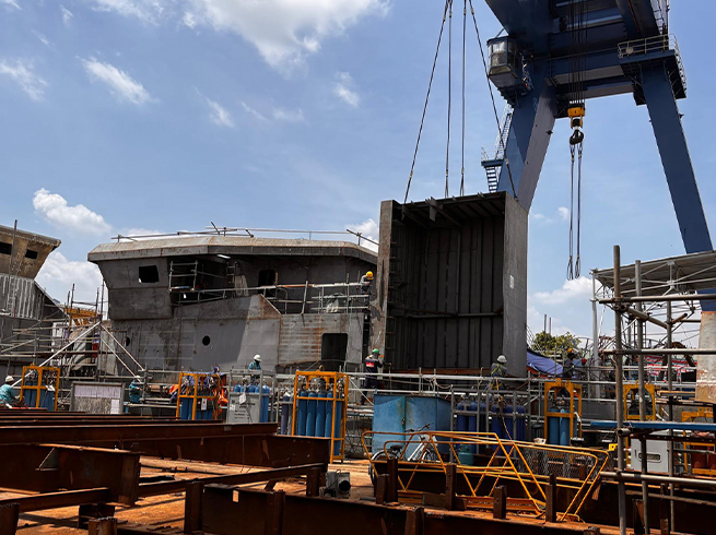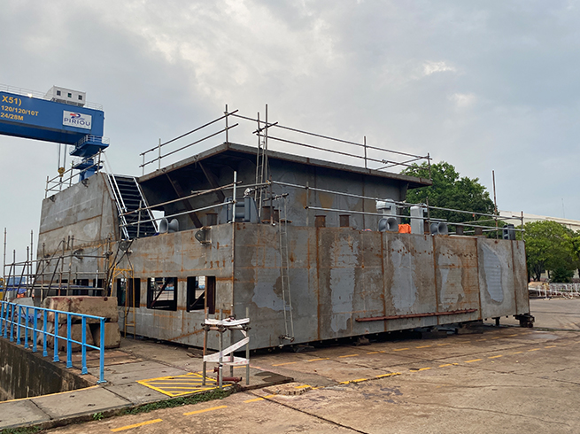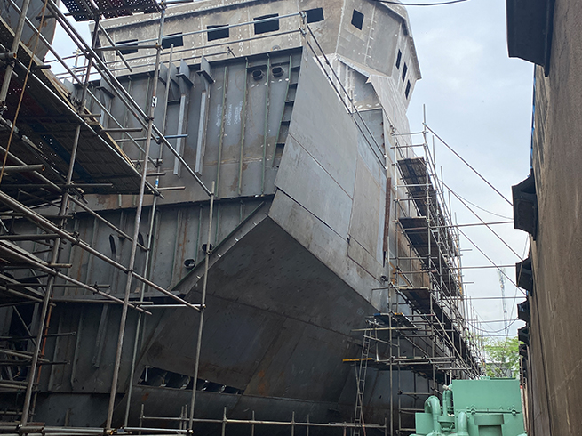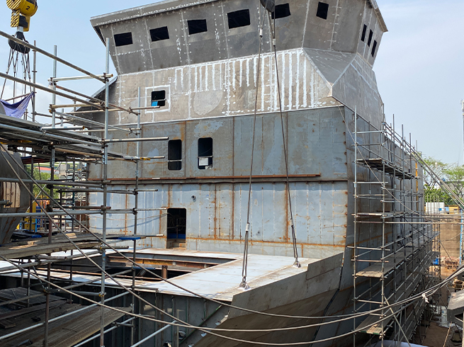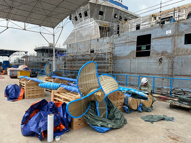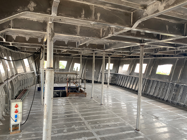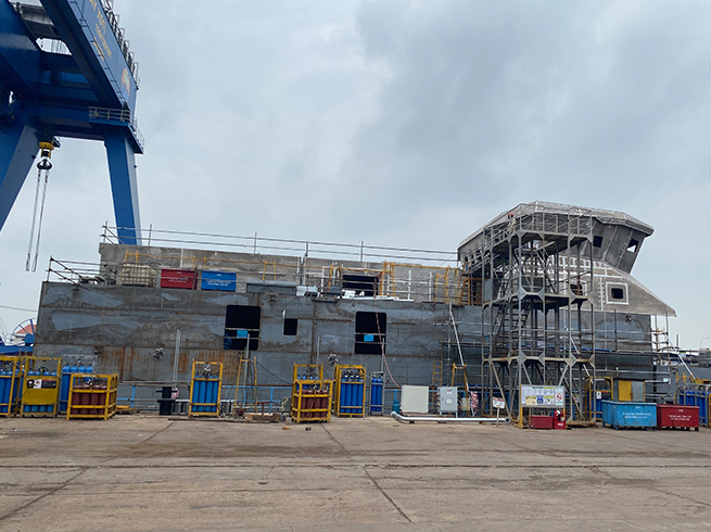 Outfitting work is progressing well, with the installation of stairs, guardrails, mooring equipment, machinery foundations, floorplate supports, electrical preparations, ventilation ducting and piping.