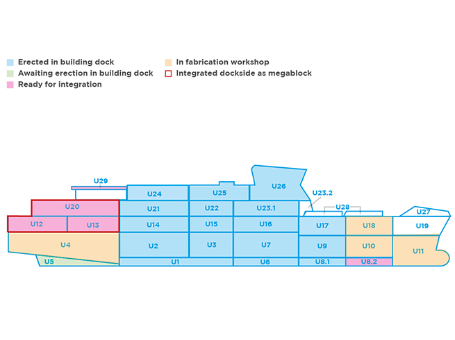 The forward hull double bottom and the inner deck of the lower holds (units 8.1 and 8.2) have been fabricated, as has the aft lower and upper holds (units 9 and 17). Units 8.1, 9 and 17 are all erected with integration ongoing.